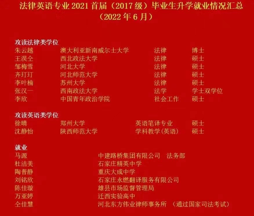 本专业面向全国,为适应经济转型升级和经济社会发展、立足河北涉外法律服务领域需求,培养具有创新精神和实践能力、具有扎实的英语基本功和宽广的英美法知识、良好道德修养、社会责任和国际经贸法律环境意识强的高素质、应用型、复合型涉外法律英语人才;掌握宽广的英语语言知识和英美法律知识,熟悉中国法律体系;具备英语言沟通协作、法律英语语言交际和服务综合应用能力;能够从事法庭口译、法律笔译工作;参与或代理涉外法律诉讼或仲裁, 熟悉涉外法务;从事法律语篇和案例分析研究和交流;具有较高的人文素养和法律文化交际能力;比较法律学习能力;具有创新意识和国际视野。