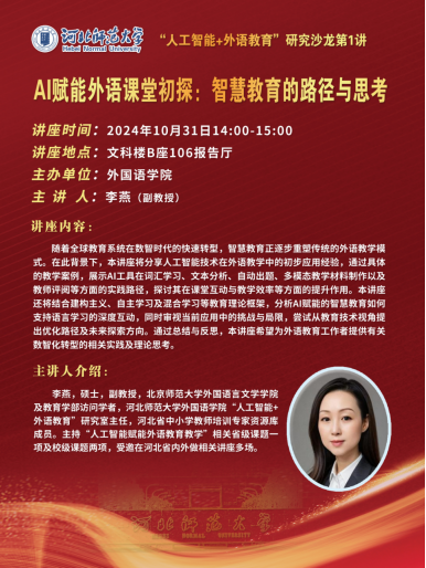 2024年10月31日下午,研究室主任李燕老师以“AI赋能外语课堂初探:智慧教育的路径与思考”为题,面向全院教职工进行了棋牌游戏 “人工智能+外语教育”研究沙龙第1讲。李老师在讲座中分享了人工智能技术在外语教学中的应用经验,通过具体的教学案例,展示AI工具在词汇学习、文本分析、自动出题、多模态教学材料制作以及教师评阅等方面的实践路径,探讨其在课堂互动与教学效率等方面的提升作用。