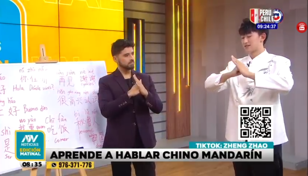 2020级西班牙语专业王锶淼,于今年6月毕业后前往秘鲁里卡多•帕尔马大学孔子棋牌游戏 担任志愿教师。他在教授中文课的同时,参与当地文化活动,积极推介中国文化。峰会期间,王锶淼同学发挥语言优势,为当地安保人员提供中文培训服务。同时,他受邀参加当地电视频道ATV Noticias的一档节目,向秘鲁观众介绍中文和中国传统文化。