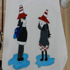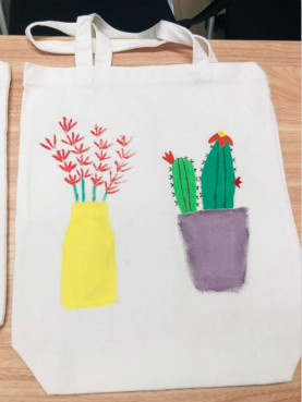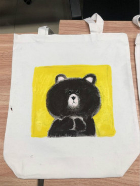 听完详细讲解之后,大家开始独自创作。相互借笔、询问色彩搭配的声音此起彼伏。同学们充分发挥自己的想象力和创作能力,成功地在帆布包上画出了别具一格的图案。同学们在绘制完自己独具特色的作品后,积极交流绘制过程中遇到的问题和自己的心得体会。