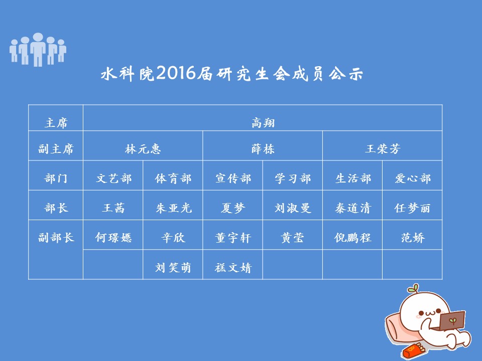 2016年10月31日,棋牌游戏 于京师科技大厦15层会议室举办了“水科院研究生会换届大会”。在秉承公平、公正、公开的原则下,副书记吕晓慧老师与2015届研会成员协商产生2016年水科院研会新成员名单。