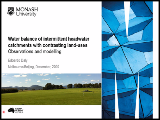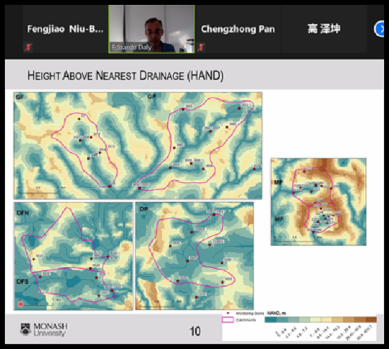 Edoardo Daly博士围绕“Water balance of intermittent headwater catchments with contrasting land-uses Observations and modelling” 主题展开讲座,介绍了在澳大利亚东南部维多利亚州的三个不同的地质环境中开展的水平衡驱动因素实验,实验结果表明地形、地质、气候的不断变化以及土地利用的改变都可能对流域水平衡产生影响。同时还对CATchment Hydrology(CATHY)模型进行了校准,并探索了各种情景,以确定降雨、地形和植被面积之间的联系。来自棋牌游戏 、清华大学、北京林业大学以及萨斯喀彻温大学、苏黎世大学、圣路易斯国立大学等多所院校的五十余位专家教授、硕博士研究生聆听了本次讲座,会后Edoardo Daly博士还就大家关心的问题开展了交流讨论。
