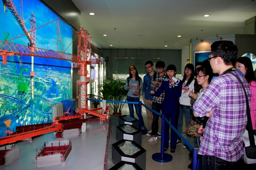 在参观了水文站之后,考察队一行驱车前往三峡工程展览馆进行参观。观看了大型纪录片《三峡梦正圆》第四集,三峡一期工程上下游围堰合拢磅礴浩大的气势让在座每位同学心潮澎湃;展馆关于三峡工程的照片、图片、模型和实物记录了三峡工程十年建设的过程,展示三峡工程的综合效益,让同学们更直观的了解三峡工程的成果和建设者们的精神风貌。