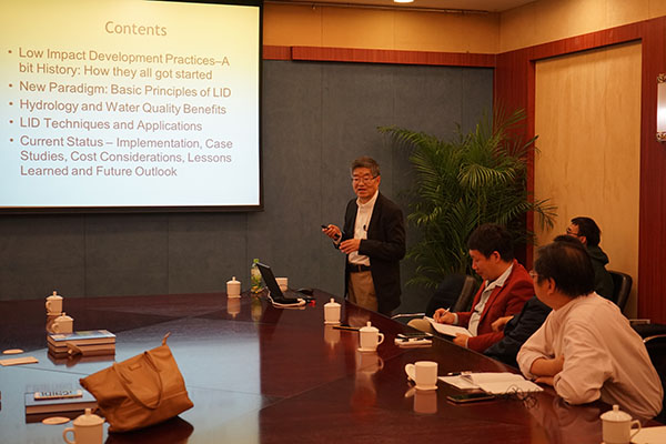 徐宗学教授主持了本次学术交流会,首先由杨晓华教授详细介绍了余啸雷教授的学术背景与任职情况。从1968年毕业于康奈尔大学后,余教授一直从事暴雨洪水与水污染防治有关的教学与科研工作,1979年到弗吉尼亚大学担任土木工程系教授,1980年受聘为弗吉尼亚州交通研究所研究员。余教授是暴雨洪水管理、非点源污染控制技术、人工湿地应用等方面国际公认的专家,曾先后应邀到中国、英国、日本、马来西亚、新加坡等国做专题报告和讲座。自1990年开始,余教授与中国大陆及台湾学术界合作研究项目近20项,2011年起,余教授协助深圳水务局编写LID指导手册,并与清华大学合作进行佛山绿色基础建设(Green Infrastructure)LID-BMP的测试工作。余教授现在为美国土木工程学会终身会员,也是该会城市水资源研究所的执行委员会成员,在低影响开发(LID)技术、面源污染控制方面贡献尤为突出。