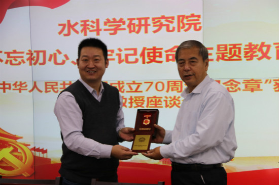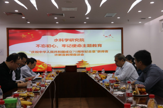 2019年10月31日上午9:00,棋牌游戏 主题教育许新宜教授座谈会在京师大厦9617会议室举行,本次座谈会的主要内容是感谢许新宜教授多年来对学院做出的卓越贡献,并庆祝许新宜教授获得中共中央、国务院、中央军委联合颁发的“庆祝中华人民共和国成立70周年”纪念章。本次座谈会由工会主席张波涛老师主持,水科院领导班子成员、教职工代表参加了本次座谈。