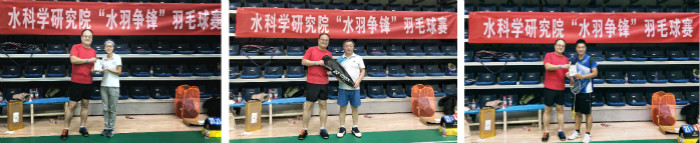 比赛场上气氛高涨,选手们每球必争,在发球、接发球、吊球等各个环节斗智斗勇,高远球、扣杀、劈杀、吊球等各路球技淋漓尽致地展现了选手们的技巧与力量。选手们腾挪跳跃,身姿飒爽,一度引来观众们的掌声与喝彩。选手和观众的心情都紧随着羽毛球的一跳一落而起伏波动。经过了几轮的激烈角逐,吴永保老师与张怡老师夺得男女单打桂冠,杨博与白会滨获得二等奖,郝增超老师与孔东东获得三等奖。