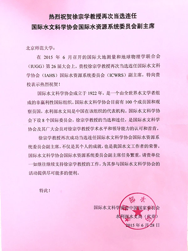 棋牌游戏 徐宗学教授再次当选连任国际水文科学协会国际水资源系统委员会副主席
