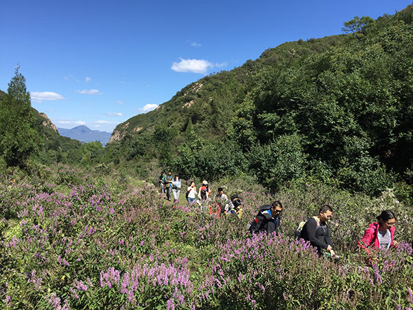 活动当日天气非常怡人,阳光明媚,空气清新。上午,老师和同学们乘车来到了燕羽山北侧的四司村,即本次徒步穿越的始发地。11时左右,大家在领队的带领下,正式开启了穿越旅程。上山路段路程较长,起伏波动较大,但花草繁茂,林木郁葱,山涧溪流涓涓,风光迤逦。同学们意气风发,热情高涨,在欣赏沿途风景的同时,相互鼓励,互相帮助,共同前行。中午时分,大家选择了一处山坡草甸进食午餐,分享食物,补充能量。下午2时许,同学们登上了燕羽山鞍部,俯瞰延庆县城,眺望远方。登高临远,豁然开朗,穷极目光,群山绵绵,村落散布,阡陌纵横,迎面清风,让人不禁茅塞顿开,神清气爽。