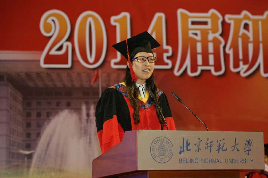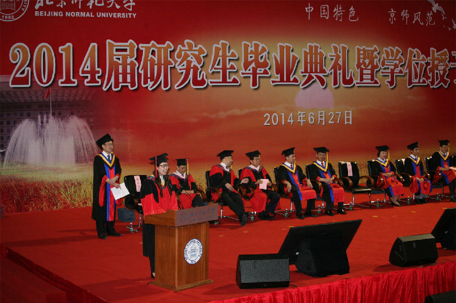李艺同学感谢母校和老师对学生们的辛勤培育,并表达了对母校和师长的不舍之情。她回忆自己三年学习历程,收获颇多,先后参加省部级以及国家自然科学基金支持的多项科研课题,并参加多次国际会议,组织和参与了科研实践和社会实践,积极参加学院和班级组织的各项活动,在SCI和中文核心期刊上发表论文七篇。李艺表明,自己以后要服务家乡,投身科研,建设西部。师大承载了同学们的梦想,大家要不断努力,向学生时代告别,开始另一段人生历程,正直为人,努力工作,服务社会,无愧母校,为实现中华民族伟大复兴的"中国梦”而奋发努力。最后,她代表全体同学再次感谢母校,感谢师长,祝愿母校蓬勃发展,老师身体健康,所有毕业生前程似锦。