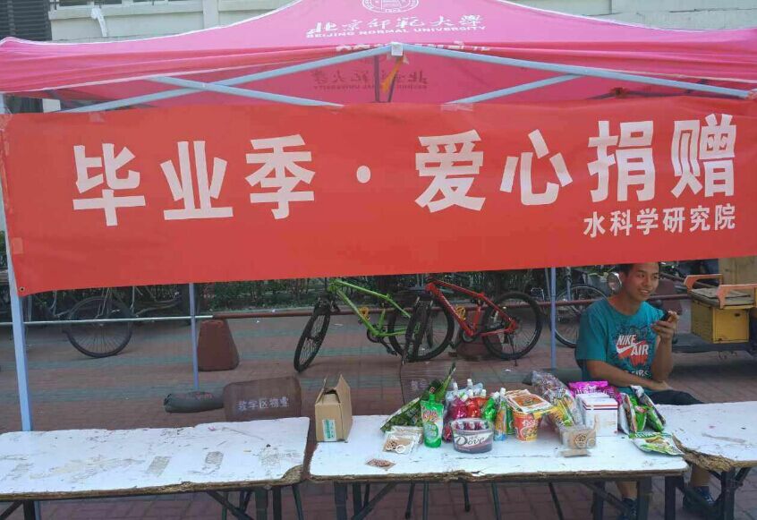 楼下举办了首届“毕业季·爱心捐赠”活动。活动前期由学院官方微信推送“爱心捐赠,不让你的毕业悄悄地走”,向学院毕业生广泛宣传文明离校,并为毕业生准备了打包纸箱、打包袋等物件,研究生会配有专人帮助毕业生搬运物品。本次外场活动主要内容为:回收毕业生们不需要的,不方便带走的书籍、生活物品、摆件等,并将其赠予有需要的师弟师妹们或者赠予物业工作人员;同时回馈赠予毕业的师兄师姐们纪念小礼品(零食、钥匙链、北师大纪念物品等)。