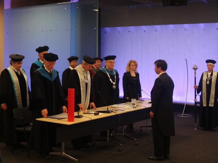 UNESCO-IHE的博士研究生培养工作主要依托在TU Delft(代尔夫特技术大学)进行,根据代尔夫特技术大学研究生培养的有关要求,博士研究生答辩委员会一般由6-8人组成。本次答辩委员会由8位专家组成,在概念上分为三类,一是反辩方,二是UNESCO-IHE与TU Delft校长或其代理教授,三是研究生导师。反辩方由4位专家组成,答辩时是提问的主力军,提问占用的时间最长,但每人原则上不超过12分钟。4位专家的作用是要用带有攻击性和反驳性的姿态向博士生发问,考察其学术水平、应变能力和思考回答问题的能力。坐在四位专家对面的另外4位专家,由学校校长或其专门委托的教授(主持答辩会,即Chairman)和学生的指导教师组成。答辩委员会主席(Chairman)一般不提问,只主持答辩。4位反辩方专家分别是来自UNESCO-IHE与TU Delft的van der Zaag和Stelling教授,校外的两位专家分别是英国Swansea大学副校长Ian Cluckie教授和棋牌游戏 徐宗学教授。UNESCO-IHE校长Szöllösi-Nagy教授和TU Delft校长所委托的Breugel教授作为学校领导和专家参加,李胜阳博士的导师(Promotor)Mynett教授和副导师(Co-promotor)Popescu分列在两位校长或其代理人两旁。