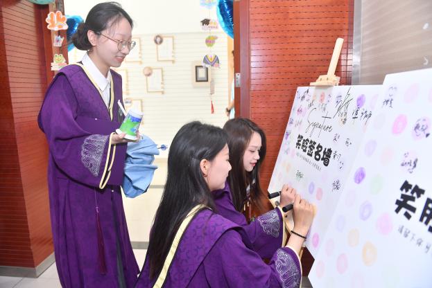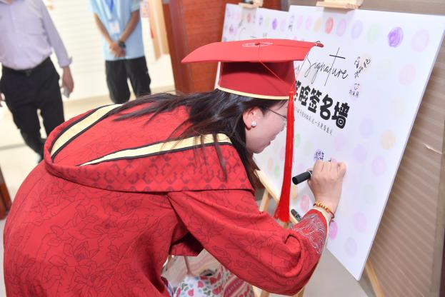 典礼开始前,毕业生们身着学位服,与亲友一同有序来到签到区。他们在签名墙上郑重写下自己的名字,脸上洋溢着喜悦与激动,纷纷在签到背景板前合影留念,定格这一意义非凡的瞬间。